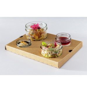 Prix 24,10 € HTConditionnement : 50CBKW29Cale en carton kraft adaptée à nos Woodbox de 5, 15 et 45 cl, avec ou sans couvercle. Elle dispose de 4 pré-découpes : Ø122mm, x2 Ø87mm et Ø57mm. Pour le transport, elle se place dans le coffret Bokobox BKB27 La cale avec quatre Woodbox est proposée en Formule Repas 1 ou 2 personnes, YFO12 ou YFO13 -