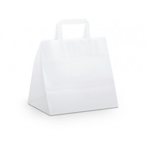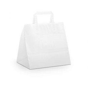 Prix 82,35 € HTConditionnement : 250STRB22Sac en papier blanc avec deux poignées plates. Il comporte une base à soufflet qui lui permet de s'étendre pour créer un fond plat et stable, qui peut être renforcée avec un carton STF22 Disponible en kraft même dimension STR22B et en blanc petite taille STRB17 -