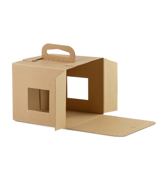 Coffret en carton kraft avec deux ouvertures latérales et une poignée rabattable, permettant de transporter jusqu'à 4 assiettes empilables :