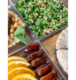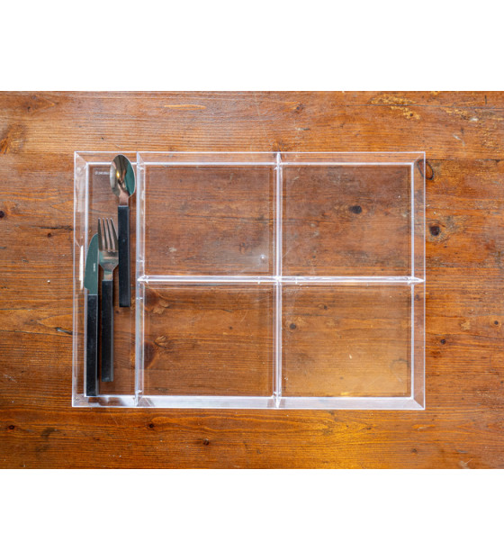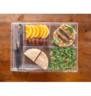 Plateau-repas Atlas 1/1 éco-conçu, avec moins de matière pour plus de légèreté ! Il est composé de 5 compartiments avec un fond dépoli : 4x 140x120 mm et 1x 250x50 mm pour les couverts et accessoires. Grâce à ses rebords évasés en guise de poignées, il est empilable, permettant un gain de place et une réduction d'emballage. Réutilisable et recyclable. Un couvercle associé est vendu séparément PACV1.