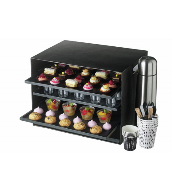 Coffret en carton premium noir gaufré, pour la présentation ou la livraison de 4 plateaux format Atlas 1/1 avec leurs couvercles. Ce coffret mettra en valeur vos buffets ou vos petits déjeuners. Des poignées latérales prédécoupées garantissent un transport en toute sécurité. Livré à plat (69 x 47 cm), facile à monter, avec des glissières de soutien à insérer dans les rainures intérieures.