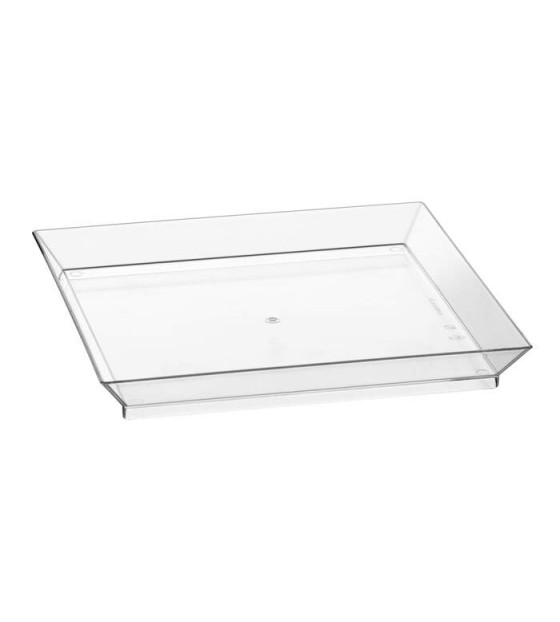 Petite assiette rectangulaire Cubik transparente, en PS recyclable.