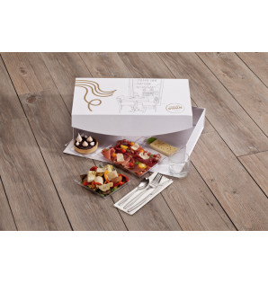 La gamme d'assiettes Cubik existe également en PS noir, en bambou, en bois, en bagasse et en carton.