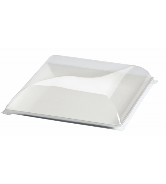 Couvercle transparent en rPET (recyclé et recyclable) d'une hauteur de 4 cm, adapté à l'assiette bagasse carrée de la gamme Komodo