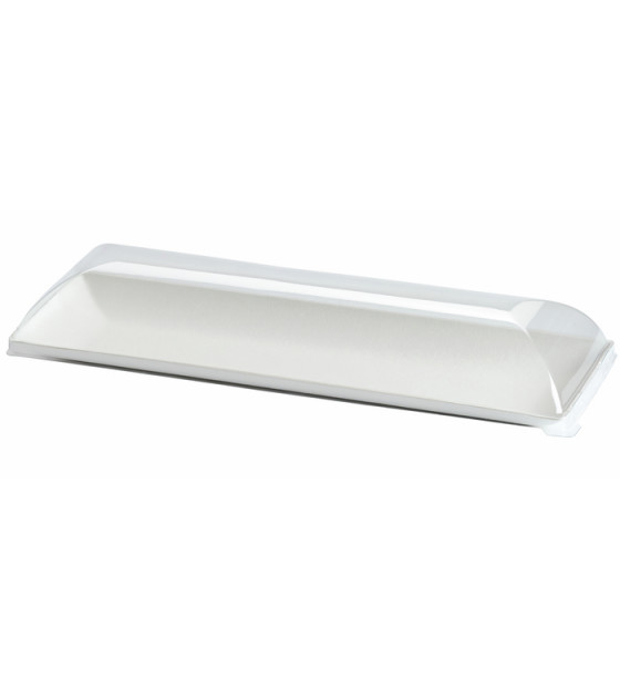 Couvercle transparent en rPET (recyclé et recyclable) d'une hauteur de 4 cm, adapté l'assiette bagasse rectangulaire de la gamme Komodo AK270