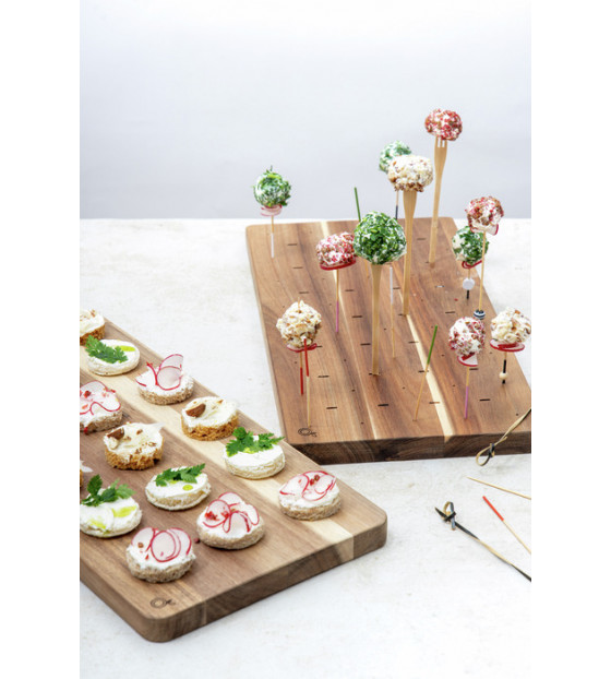 En version réversible, le recto est une planche et le verso dispose de 40 perforations pour placer des sticks et de 28 perforations 2x10 mm pour fixer des mini fourchettes.
