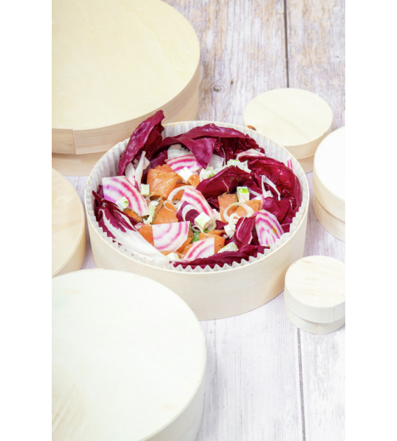 Boite ronde de 1,5 litres en bois de peuplier français, issu de forêts gérées durablement, fabriquée en France. Elle est vendue avec une caissette blanche en papier/PET apte au contact alimentaire et étanche.