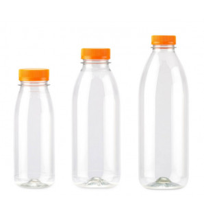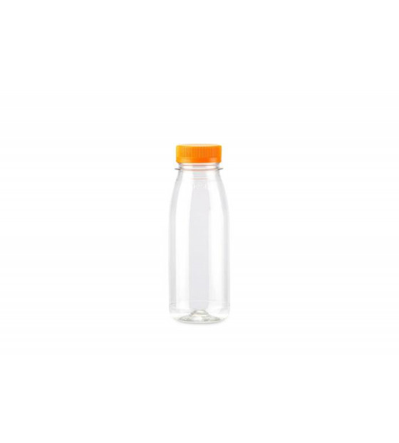 Bouteille transparente et légère, avec un couvercle à vis orange (conditionné à part, inclus dans chaque carton). Vissé sur la bouteille, le bouchon s'ancre sur le col et devient inviolable. Il reste attaché une fois ouvert. Solution adaptée à la vente à emporter ou à la livraison. Disponible en 3 tailles : 25 cl JUS25, 50 cl JUS50 et 100 cl JUS100.