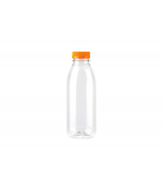 Bouteille transparente et légère, avec un couvercle à vis orange (conditionné à part, inclus dans chaque carton). Vissé sur la bouteille, le bouchon s'ancre sur le col et devient inviolable. Il reste attaché une fois ouvert. Solution adaptée à la vente à emporter ou à la livraison. Disponible en 3 tailles : 25 cl JUS25, 50 cl JUS50 et 100 cl JUS100.