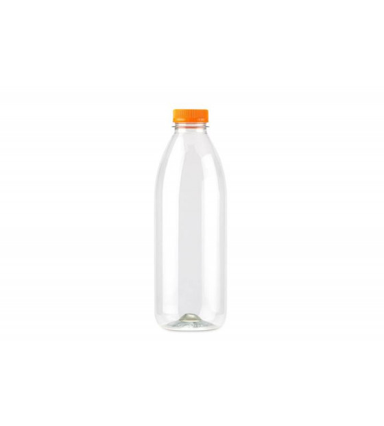 Bouteille transparente et légère, avec un couvercle à vis orange (conditionné à part, inclus dans chaque carton). Vissé sur la bouteille, le bouchon s'ancre sur le col et devient inviolable. Il reste attaché une fois ouvert. Solution adaptée à la vente à emporter ou à la livraison. Disponible en 3 tailles : 25 cl JUS25, 50 cl JUS50 et 100 cl JUS100.