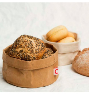 Contenant en papier kraft lavable et réutilisable, particulièrement adapté à la présentation de pains et de viennoiseries. Hauteur réglable en retournant le bord. Peut être utilisé avec la pince de service PSB25