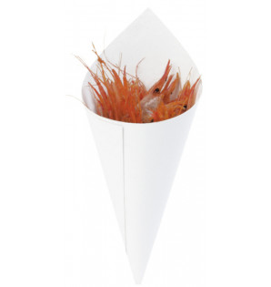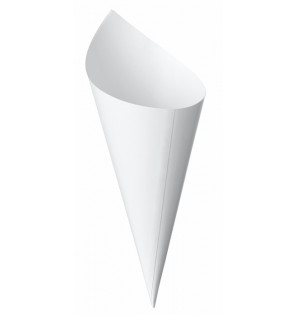 Cône blanc en carton résistant aux graisses (mais non compatible avec des liquides), idéal pour emporter des frites, des churros, des bonbons ou tout autres produits secs.