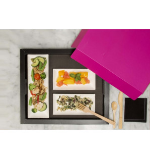 Couvercle en carton souple réversible, fuchsia ou noir, adapté aux plateaux repas Thema.