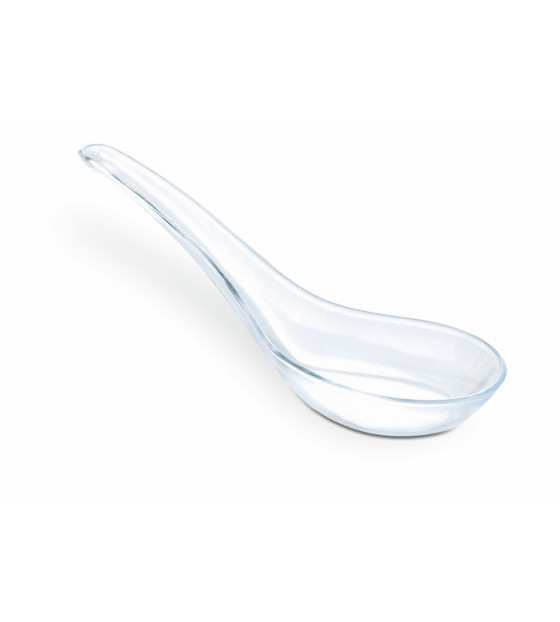 Cuillère de dégustation en PS transparent. De forme creuse, elle convient aux mises en bouche crémeuses : dips, espumas, tartares... Elle est lavable et réutilisable.