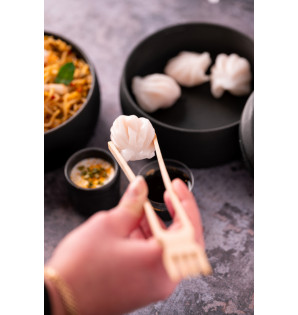 Couvert bambou 2 en 1, à la fois baguette et fourchette, très pratique pour savourer des préparations asiatiques sans appréhension ! Sa grande taille permet d'être utilisé dans des contenants profonds comme le PFK48, le PS475 ou le MBN40. Hauteur des baguettes 170 mm et de la fourchette 4 dents 30 mm. Son emballage individuel transparent garantit une parfaite hygiène.