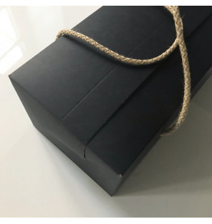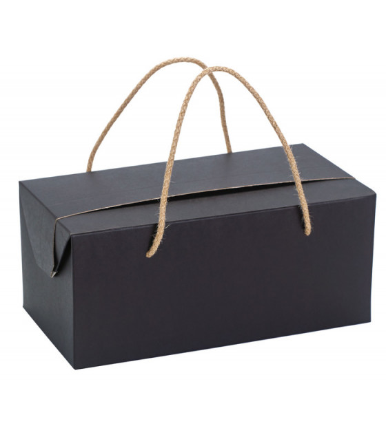 Black cardboard lunch box, white interior, with two natural cords as handles. Its top opening facilitates filling and gives a clear view of its contents. Delivered flat-packed, it is easy to assemble thanks to its automatic bottom. To finish, you have to insert the cords on both sides.