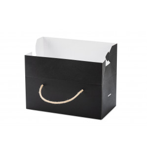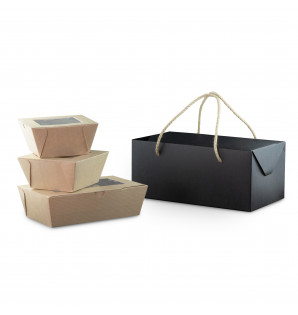 Coffret repas en carton noir intérieur blanc, avec deux cordelettes naturelles en guise d'anses. Son ouverture par le haut facilite le remplissage et donne une bonne visibilité de son contenu. Livré à plat, il se monte facilement grâce à son fond automatique, les cordelettes sont à insérer à la fin. Faubourg existe également en version kraft FBG28K
