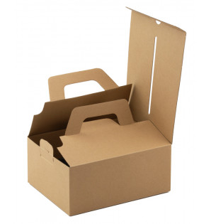 Coffret en carton kraft résistant et pratique avec ouverture par le haut. Avec une poignée rabattable, il est empilable. Ce qui permet de préparer à l'avance vos formules repas à emporter et de les stocker. Livré à plat, il facile à monter grâce à son fond automatique.