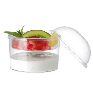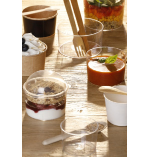A la fois insert et couvercle dôme en rPET transparent (recyclé et recyclable), il se fixe sur la verrine Bodeglass 30 cl BDG30. Cette solution est tout indiquée pour composer des duos de desserts ou de brunchs : yaourt avec muesli/baies fraiches/granola, salade avec sauce, soupe avec croûtons.... Fabriqué en France, il est recyclable.