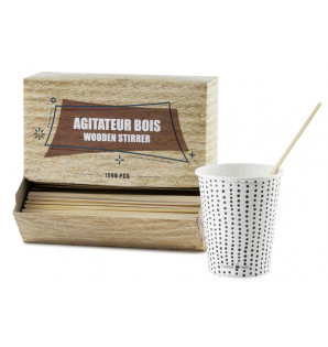Grand agitateur en bois de 178 mm, adapté à tous les verres et gobelets. Une seule référence pour pouvoir remuer tous vos cocktails, café long ou autres boissons. Livré avec un distributeur en carton.