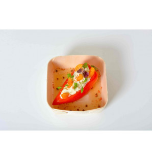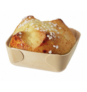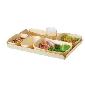 Cette petite assiette carrée en bois de peuplier est revêtue d'une fine pellicule de papier sulfurisé qui la rend ingraissable et apte au contact alimentaire.
