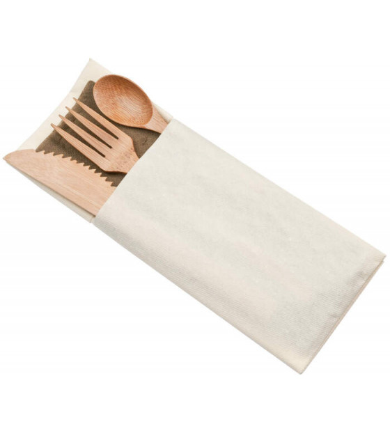 Kit 5/1 de couverts Bambou Premium, agrémentés d'un vernis alimentaire. De haute qualité, ils sont parfaits pour vos formules à emporter haut de gamme. Le kit est composé de : - Couteau : CBB17, 170 mm - Fourchette : FBB17, 170 mm - Petite cuillère : PCB15, 115 mm - 1 serviette papier intissé 38x38 cm - 1 set de table papier intissé 40x32 cm Les couverts sont aussi disponibles en vrac (100 de chaque) KBA300 et en kits : KBA312, KBA412, KBA612