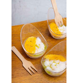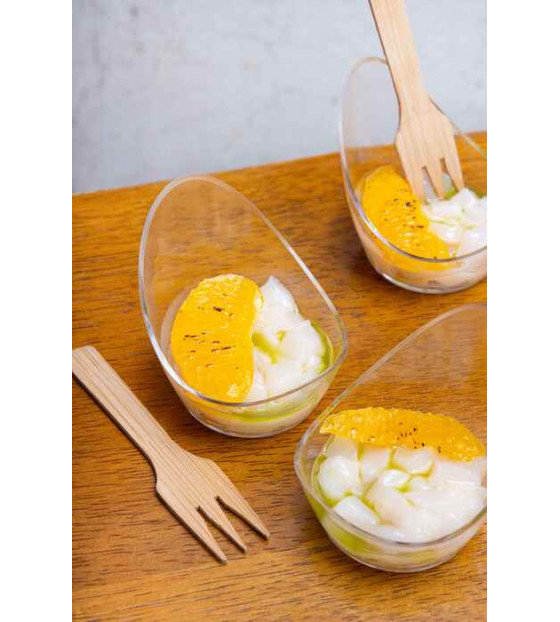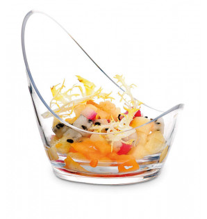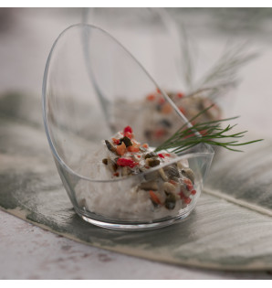 Mini verrine de 3 cl à bord relevé en forme de cuillère. Son design unique ajoutera une note d'élégance à vos présentations. En PS transparent, elle est réutilisable et recyclable.