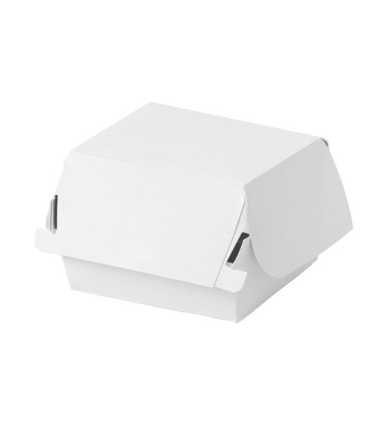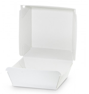 Mini box burger en carton blanc idéal pour une présentation ludique de mini burgers ou de mini sandwichs. Ingraissable, il est résistant à la chaleur (100°C).