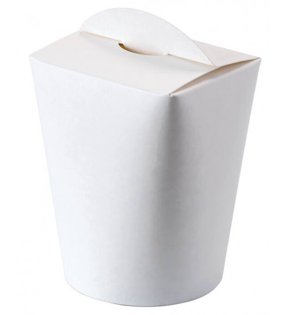 Noodle box en carton blanc de 50 cl, pour présenter des nouilles chinoises classiques ou d'autres recettes exotiques cuisinées au wok (nouilles de riz au poulet pad thaï, satay indonésien, crevettes à la cantonaise...).
