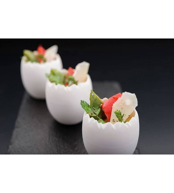 Verrine en PP, en forme de coquille d'œuf, parfaite pour des créations culinaires autour de l'œuf ! Son design avec un à-plat permet de la présenter en toute stabilité. Elle est apte à la congélation et au micro-ondes. Lavable, réemployable, puis recyclable en fin de vie.
