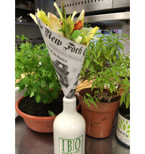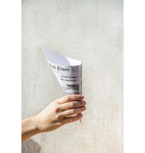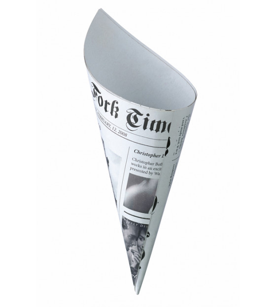 Cône style impression papier journal, en carton résistant aux graisses (mais non compatible avec des liquides), idéal pour emporter des frites, des churros, des bonbons ou tout autres produits secs.