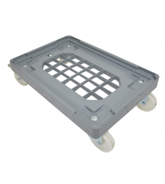 Socle rouleur Euronorme en PP gris. Convient aux bacs de 600x400 et 400x300 mm. Hauteur :160 mm. Capacité de charge 250kg. Il n'y a pas de frein ni de blocage sur les roues pour garantir un pivotement complet.