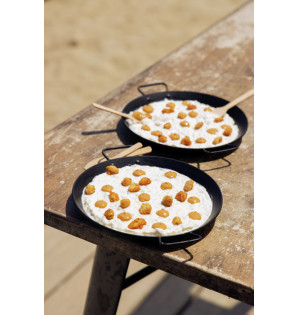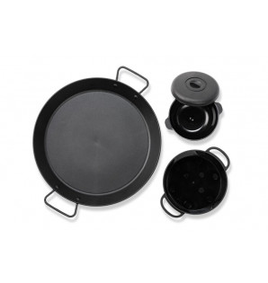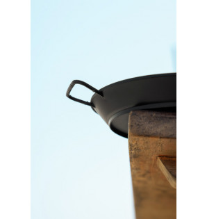 Assiette noire avec anses style plat à paëlla (Ø220 mm avec anses). En PP noir, elle est micro-ondable et apte à la congélation.