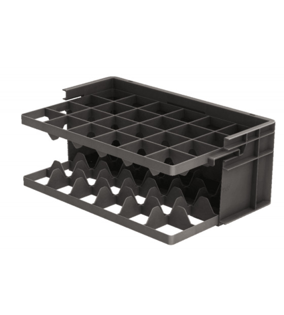 Bac Euronorme avec 24 alvéoles adaptées au transport de verres jusqu'à Ø85 x h70 mm. En PP gris, il est robuste et réemployable. Nous proposons 6 bacs Euronorme avec alvéoles :