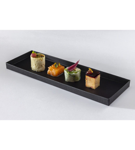 Plateau haut de gamme Atlas 1/4, en carton noir à bords droits. Sa surface satinée et son aspect extérieur texturisé lui confèrent un design raffiné et haut de gamme. Pour garantir une parfaite hygiène et un transport sécurisé, il dispose d’un couvercle transparent ajusté (h40 mm) CPL27. Apte au contact alimentaire.