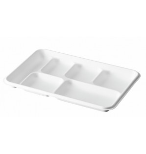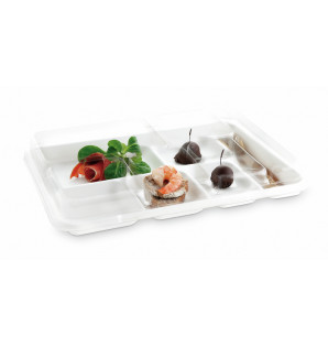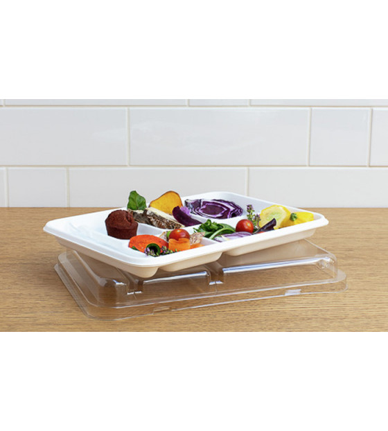 Plateau repas en bagasse avec 6 alvéoles, dont 1 alvéole latérale pour les couverts, verre ou accessoires. Il peut se compléter avec un couvercle transparent recyclable CPF6R, permettant une parfaite visibilité de son contenu. Le socle peut passer de la congélation, au four ou au micro-ondes. Plateau Snack 6 est une solution économique pour les repas à livrer (collectivités, écoles, entreprises...).