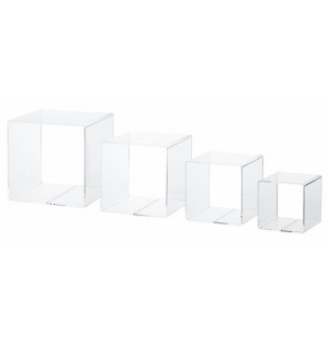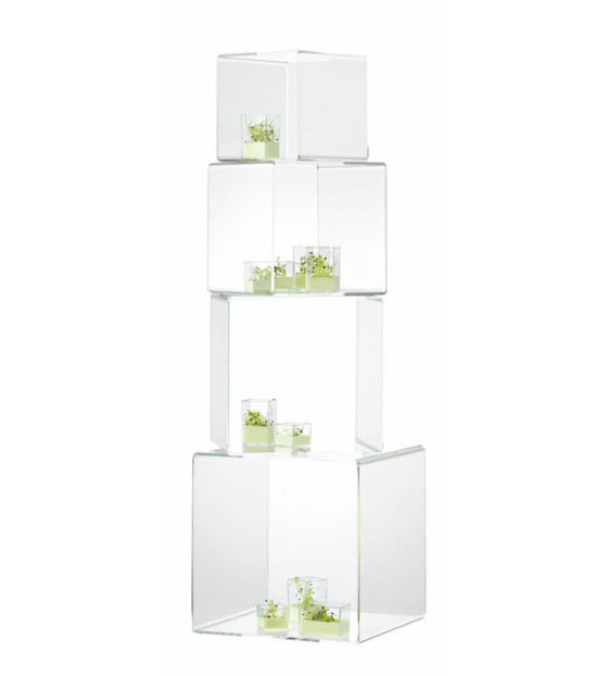 Jeu de 4 cubes gigognes, à disposer horizontalement ou à empiler verticalement, pour une hauteur totale de 80 cm. Fabriqué en PMMA, il est réutilisable et recyclable. Dimension des 4 cubes : 25 x 25 cm | 21,5 x 21,5 cm | 18 x 18 cm | 15 x 15 cm