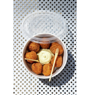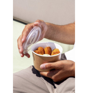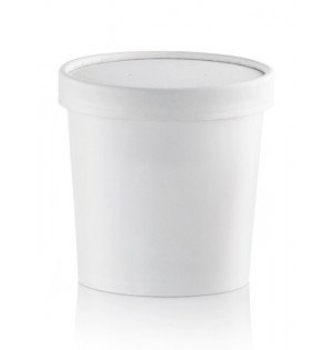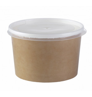 Pot à emporter en carton/PE résistant aux liquides chauds et aux graisses, avec couvercle en PP micro-ondable.