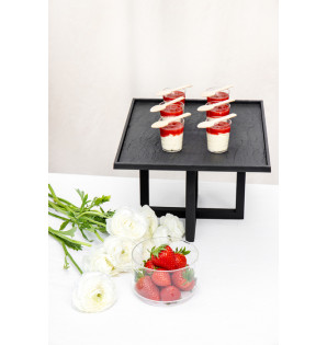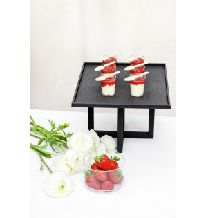 Support en bois lisse noir (non antidérapant), avec lequel vous pouvez obtenir 2 hauteurs de présentation : h150 mm à l'horizontale ou h175 mm à la verticale. Fabriqué artisanalement en France. Réutilisable.