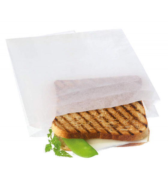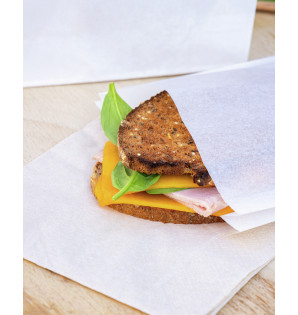 Sac à sandwich en papier ingraissable, format croque-monsieur. Certifié FSC®, il est une solution écologique de présenter vos produits. Il peut être utilisé dans une machine à croque-monsieur/panini, au four pour être réchauffé ou en contact direct avec un grill.