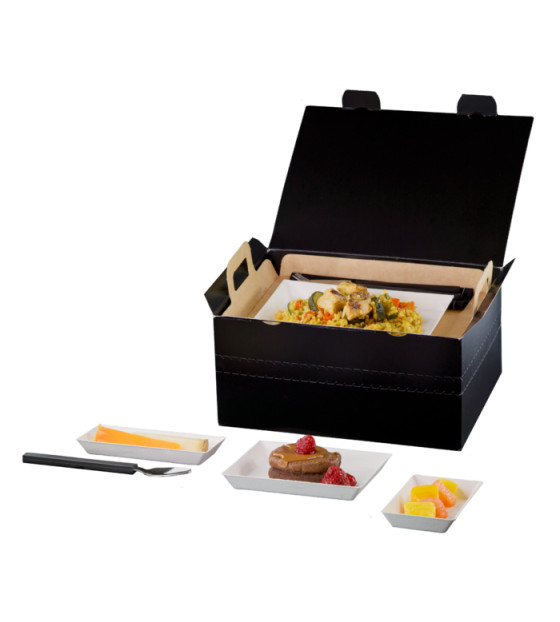 Composé de : -1 coffret Essentiel + 1 séparateur - 1 assiette Cubik bagasse 180x130 + 1 assiette Cubik bagasse 130x130 + 2 raviers Cubik bagasse 130x65 avec leurs couvercles