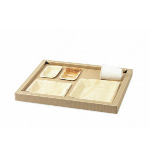 Prix 410,90 € HTConditionnement : 100BK4ANPlateau-repas prêt à l'emploi et livré monté, composé de : - Socle + cale en carton kraft micro cannelures, recyclables - Couvercle en carton noir, recyclable - 1 assiette 180x180mm, 1 assiette 170x120mm et 2 assiettes 120x70mm. La vaisselle en palmier est apte à la cuisson au four et au micro-ondes. Le plateau est également disponible avec un couvercle cloisonné transparent BK4A -